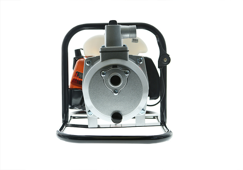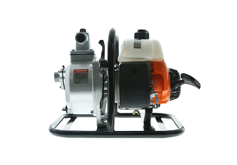 Sturm BP87013 – компактная универсальная бензиновая мотопомпа для домашнего применения – отличное подспорье для организации полива приусадебных территорий и садовых участков, наполнения и осушения бассейнов и колодцев в условиях отсутствия электричества. Модель характеризуется небольшими габаритами и массой, что исключает трудности при размещении на хранение и транспортировке – агрегат легко помещается даже в багажнике легкового автомобиля. Внутри усиленной Т образной рамы, которая одновременно является и переносной рукоятью, размещается двухтактный бензиновый двигатель рабочим объемом 40 см3 (мощность 1.45 кВт / 2 л.с.) и центробежный насос. Аппарат может перекачивать до 133 л / мин, что вполне достаточного для эффективного орошения приусадебного участка, способен осуществлять забор жидкости с глубины до 8 метров, что позволяет выкачивать воду из достаточно глубокого колодца или скважины и демонстрирует высоту подъема (напор) жидкости в 30 метров. Модель проста в обслуживании и эксплуатации и не требует от пользователя каких-либо специальных навыков. В качестве топлива используется смесь масла для двухтактных двигателей с бензином АИ-92 в пропорции 1:25. Запуск мотопомпы производится с помощью ручного стартера.