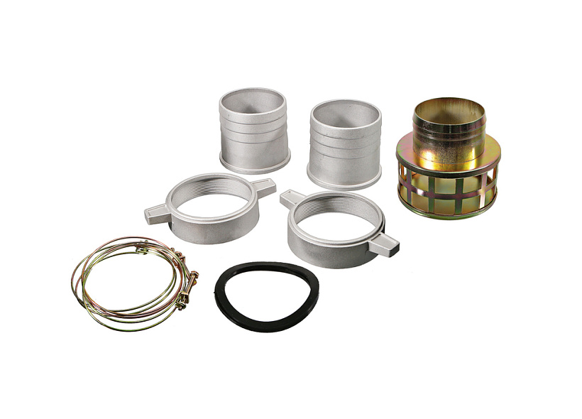 Необходимые инструменты в комплекте — к мотопомпе прилагаются хомуты для подключения шланга.