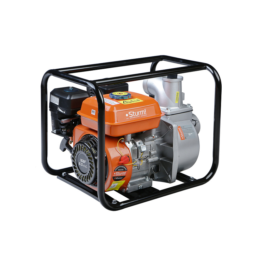 Sturm BP-80 – высокопроизводительная универсальная бензиновая мотопомпа для домашнего, жилищно-коммунального или строительного применения. Имеет классическую компоновку: двигатель и насос смонтированы внутри прочной усиленной трубчатой рамы, страхующей основные узлы от случайных повреждений, при транспортировке. Мотопомпа оснащается четырехтактным бензиновым двигателем рабочим объемом 196 см3 (мощность 5 кВт / 6,5 л. с.) с верхним расположением клапанов (OHV) и воздушным охлаждением. Благодаря ряду технических решений: коленчатому валу повышенной прочности и усиленной цилиндро-поршневой группе, силовой агрегат надежен и неприхотлив в использовании. На модели Sturm BP-80 установлен самовсасывающий насос центробежного типа, обеспечивающий высокую максимальную производительность 1100 л / мин – один из лучших показателей среди мотопомп аналогичной мощности. Агрегат способен осуществлять забор жидкости с глубины до 8 метров, что позволяет выкачивать воду из достаточно глубокого колодца или скважины, и демонстрирует высоту подъема (напор) жидкости – 30 метра. Модель проста в обслуживании и эксплуатации и не требует от пользователя каких-либо специальных навыков. Рекомендуемое топливо – бензин АИ-92. Запуск агрегата производится с помощью ручного стартера.