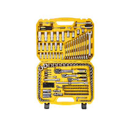 - Комплектация: Головки торцевые 1/2”: 10, 11, 12, 13, 14, 15, 17, 19, 20, 21, 22, 24, 27, 30, 32 мм; Головки удлиненные 1/2”: 16, 17, 18, 19, 22 мм; Головки торцевые Torx 1/2”: E10, E11, E12, E14, E16, E18, E20, E24; Головки торцевые свечные 1/2”: 16, 21 мм; Удлинитель 1/2”: 125, 250 мм; Шарнир карданный 1/2” Рукоятка трещоточная 1/2”, 90 зуба Ключи комбинированные: 8, 9, 10, 11, 12, 13, 14, 15, 16, 17, 18, 19 мм; Держатель бит 1/2” x 5/16”; Головки торцевые 3/8”: 10, 11, 12, 13, 14, 15, 16, 17, 18, 19 мм; Головки удлиненные 3/8”: 10, 11, 12, 13, 14, 15 мм; Шарнир карданный 3/8” Рукоятка трещоточная 3/8”, 90 зуба; Головки торцевые 1/4”: 4, 4,5, 5, 5,5, 6, 7, 8, 9, 10, 11, 12, 13, 14 мм; Головки торцевые удлиненные 1/4”: 4, 5, 6, 7, 8, 9, 10 мм; Удлинитель 1/4”: 50, 100 мм; Головки торцевые Torx 1/4”: E4, E5, E6, E7, E8; Шарнир карданный 1/4” Вороток Т-образный 1/4”, 115 мм; Рукоятка трещоточная 1/4”, 90 зуба; Ключи шестигранные: (1,27, 1,5, 2)-2шт, 2,5, 3, 4, 5 мм Держатель бит Отвертка-вороток 1/4”, 150 мм; Головки с вставками 1/4”: SLOTTED: SL4, SL5,5, SL6,5, SL7; POZIDRIV: PZ1, PZ2, PZ3 TORX: T8, T9, T10, T15, T20, T25, T27, T30; T-TORX: T8T, T9T, T10T, T15T, T20T, T25T, T27T, T30T HEX: H3, H4, H5, H6 PHILIPS: P1H, P2H, P3H Биты 5/16”, 30 мм: PHILIPS: P2H, P3H, P4H; HEX: H6, H7, H8, H10, H12, H14; SLOTTED: SL6, SL8, SL10, SL12; POZIDRIV: PZ2, PZ3, PZ4; ТORX: T40, T45, T50, T55, T60; Spline: M5, M6, M8, M10 TAMPERPROOF TORX: T40H,T45H, T50H, T55H, T60H; Адаптер для торцевых головок 1/2”, 3/8, 1/4”; Биты 25 мм: HEX: H3, H4, H5, H6 HEX: H3, H4, H5, H6(с удержанием) PHILIPS: PH1, PH2 POZIDRIV: PZ1, PZ2 TORX: T8, T10, T15, T20, T25 TT: 8, 10X2ШТ, 15, 20Х3ШТ, 25Х2ШТ, 40 Spline: M5, M6, M8 SLOTTED: S4L, S5L, S5.