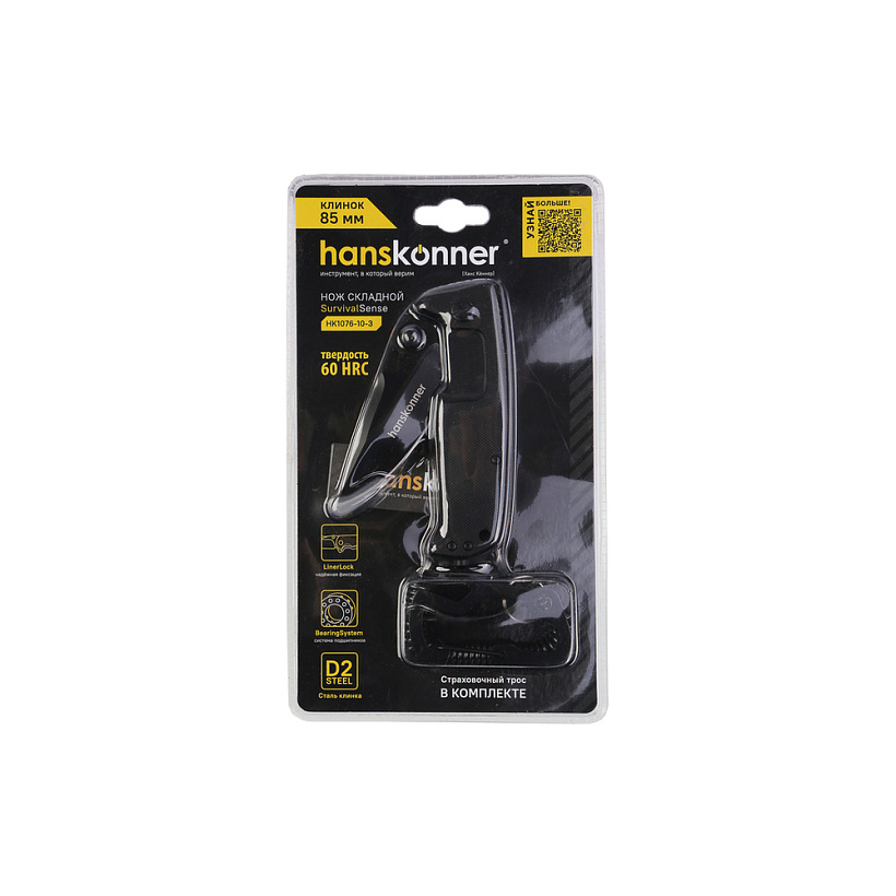 В комплектацию входит прочный страховочный трос с металлической жилой для защиты от случайной потери ножа.