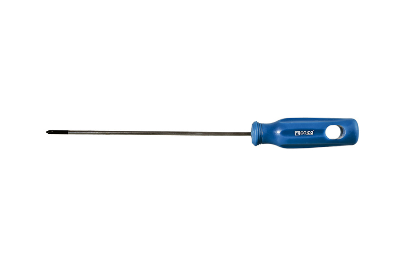 Отвертки имеют эргономичную ПВХ рукоятку с отверстием для подвеса. Рабочая часть выполнена из качественной инструментальной стали, что определяет ее прочность и износостойкость. Жало отвертки намагничено для удержания метизов при работе.
