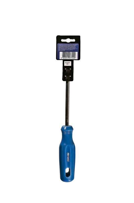 Эргономичная рукоятка из ПВХ с удобным отверстием для подвеса. Рабочая часть отвертки выполнена из высоколегированной хромованадиевой инструментальной стали и имеет высокую твердость и прочность, что определяет длительный срок службы инструмента.