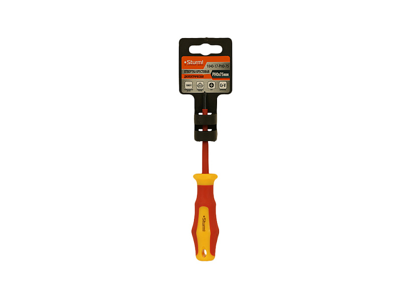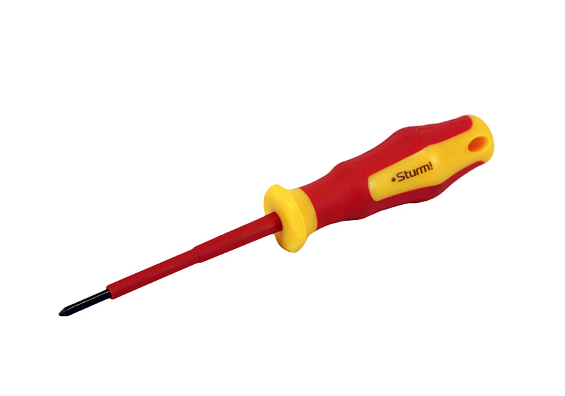 Отвертка Sturm! 1040-17-PH0-75 с многокомпонентной ручкой эргономичной ручкой. Отвертка для  безопасной работы на оборудовании с максимально допустимым напряжением 1000 В. Многогранный край ручки для защиты от перекатывания отвёртки на рабочем месте.