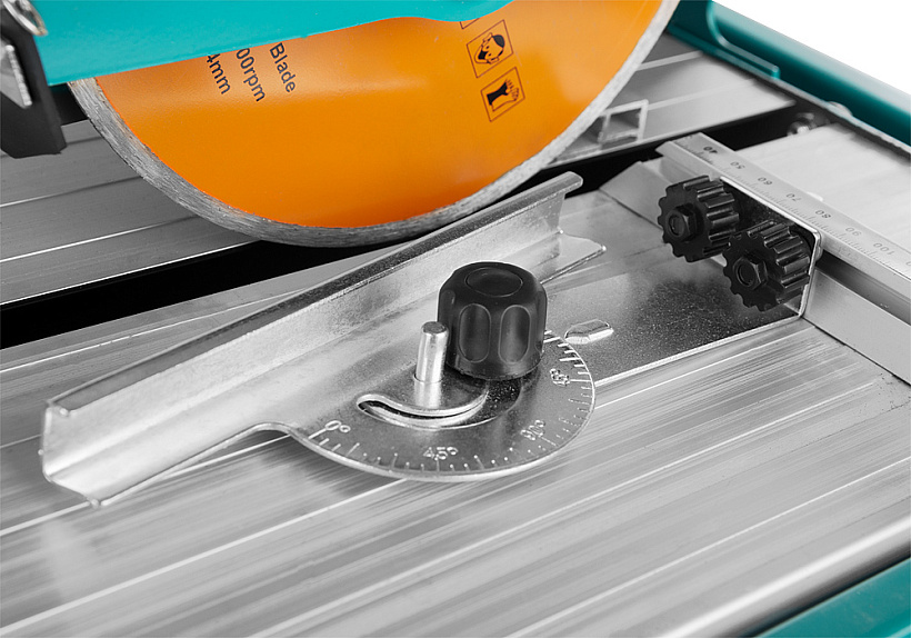 Инструмент оснащен рабочим опорным столом из нержавеющей стали, с помощью которого можно уверенно обрабатывать плитку даже очень большого размера. Устойчивый к деформациям, рама с рабочим органом, с возможностью установки наклона от 0 до 45 градусов, обеспечивает высокое качество наклонного реза плитки без опасности ее смещения в ходе резки. Шкала на линейке и упор позволяют устанавливать размер изделия с точностью до миллиметра. Дополнительно в комплект входит рейка угла скоса для выполнения диагональных резов под углом до 45°.