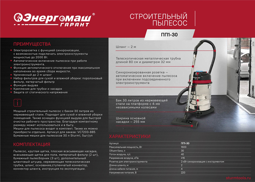 Промышленный пылесос Энергомаш ГАРАНТ ПП1-30