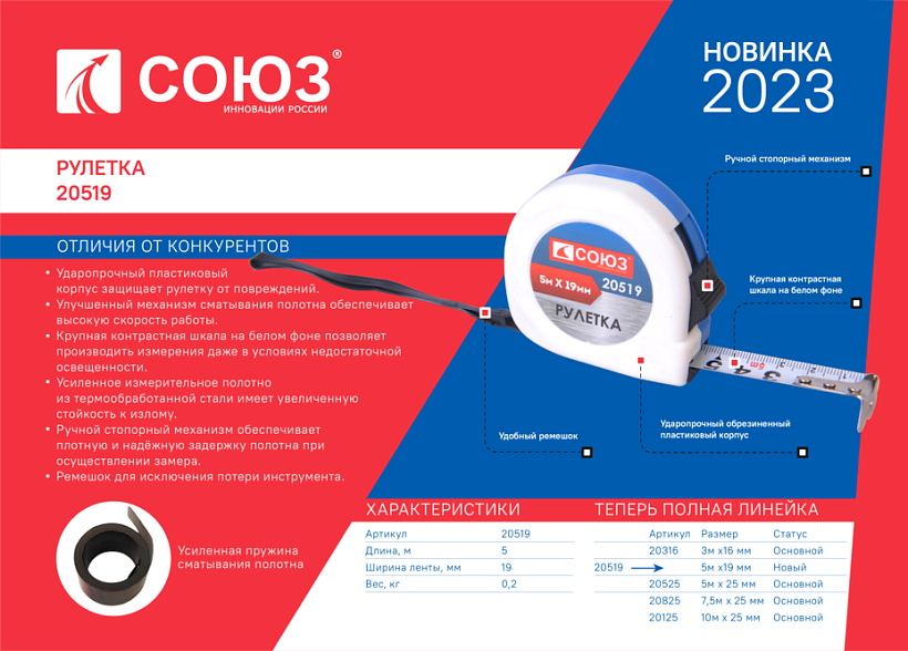 Рулетка 5х19мм, пластиковый корпус, СОЮЗ