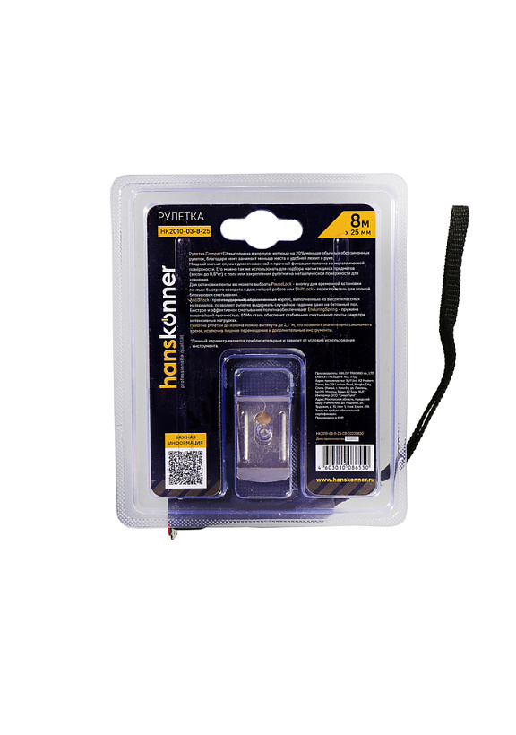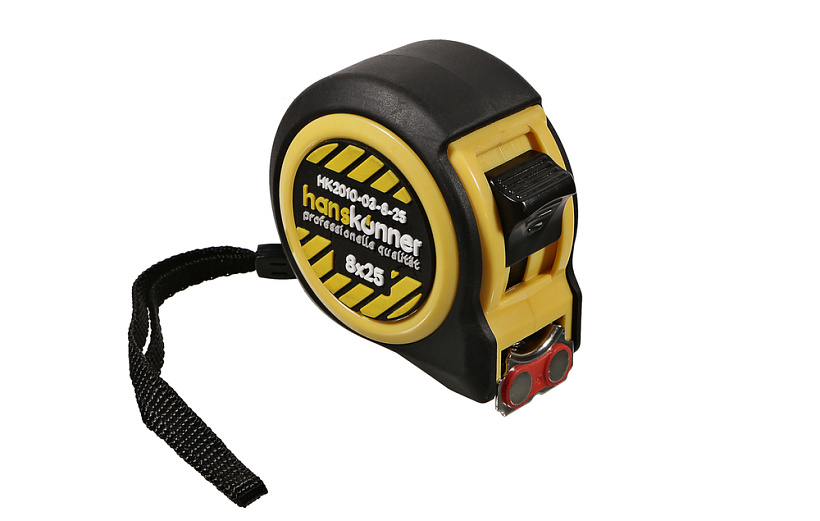 Рулетка 8x25мм, 2 стопа, компактный корпус, мощный магнит, Hanskonner