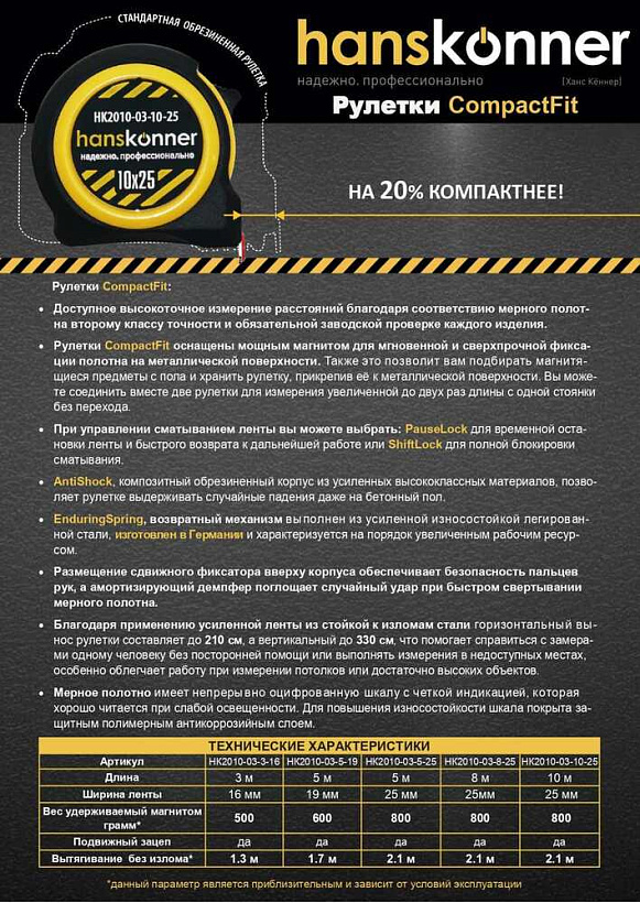 Корпус на 20% меньше стандартного - удобное использование и хранениеПолотно изготовлено из 60C стали и на 15% толще, чем у обычных рулеток - более дальний вылет без излома и устойчивость к внешнему воздействию