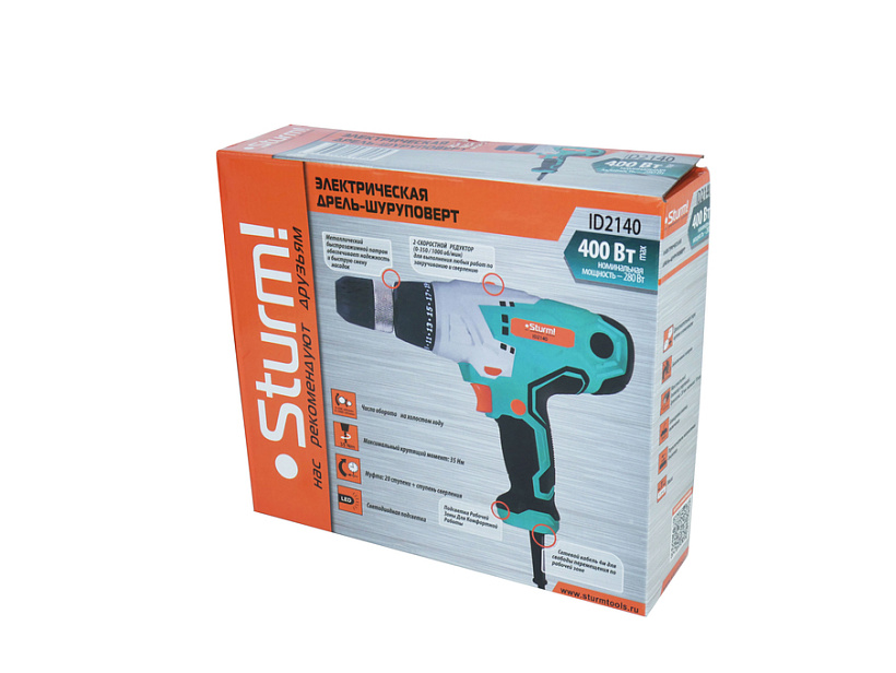 Sturm ID2140 – универсальный двухскоростной сетевой шуруповерт бытового назначения. Инструмент обладает выверенной компоновкой и оптимально подобранными массово-габаритными показателями: узкий корпус способствует эффективной работе в стесненных условиях, смещенная вперед рукоять положительно влияет на развесовку, обеспечивая лучший контроль, небольшая масса гарантирует меньшую утомляемость пользователя при длительной серийной работе. Надежность хвата обеспечивается обилием прорезиненных, с выраженным рельефом, накладок на элементах корпуса и рукояти. Модель оснащена электромотором мощностью в 400 Вт и усиленным редуктором, позволяющим реализовать максимальный крутящий момент – 35 Н м. Благодаря муфте регулировки усилия c 19 фиксированными положениями, значение момента затяжки на валу шпинделя можно изменять в широком диапазоне – это дает возможность максимально гибко подстраивать инструмент применимо к используемым крепежным элементам и их размеру, а также, материалу заготовки. Модель имеет две скорости: режим пониженных оборотов (0 – 350 об / мин) предназначен для работ с крепежом, режим повышенных оборотов (0 – 1000 об / мин) – для сверления отверстий в различных материалах. Важными особенностями Sturm ID2140 являются встроенная LED подсветка рабочей зоны, облегчающая использование инструмента в условиях плохой освещенности, полуметаллический патрон, гарантирующий надежную фиксацию оснастки, а также наличие длинного четырехметрового сетевого кабеля, который способен без задействования дополнительного удлинителя обеспечить рабочую зону площадью до 50 квадратных метров. Для удобства обслуживания предусмотрен быстрый доступ к щеткам, позволяющий производить их замену без демонтажа элементов корпуса.