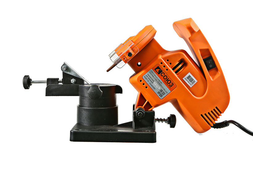 Для большей безопасности во время заточки в модели применена винтовая и клиновая фиксация обрабатываемого элемента, препятствующая его смещению и выскальзыванию из рабочего ручейка. Прижимной механизм обеспечивает точность зажима зубьев цепи под требуемым углом к рабочей поверхности абразивного диска для получения правильной конфигурации режущих плоскостей.