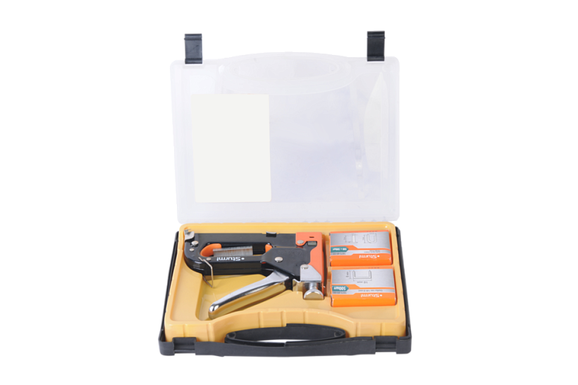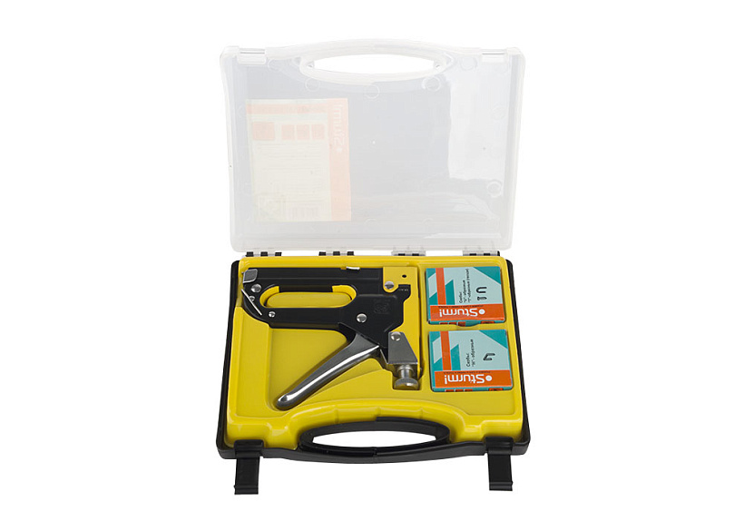 Степлер Sturm! 1071-01-S1 подходит для скоб 53F(6-14мм),S и 140(6-14мм),гвоздей J(10-14мм). В удобном пластиковом кейсе, с набором скоб. оснащен регулируемым механизмом контроля силы удара.