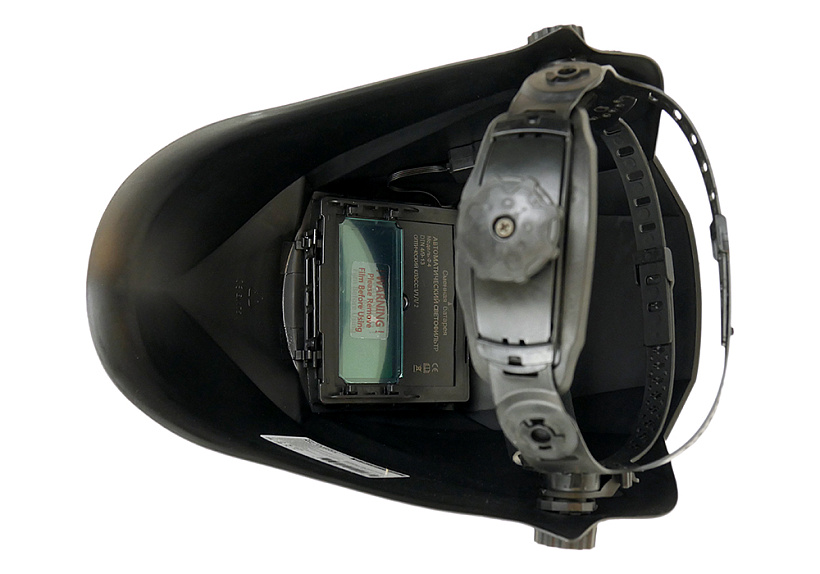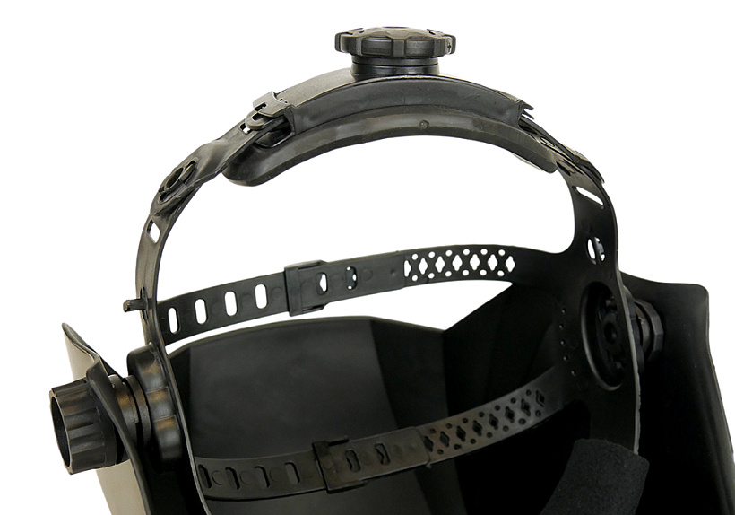 Щиток оснащен удобной крепежной 3D системой с простой настройкой под любой размер головы. Для точной подгонки наголовной ленты применен поворотный механизм с автофиксацией, а комфортное положение маски по высоте можно предварительно выставить с помощью реечного пошагового механизма. Ручка фиксации щитка для удобства имеет крупную насечку, позволяя пользователю выполнить быстрый зажим, не снимая сварочных рукавиц.