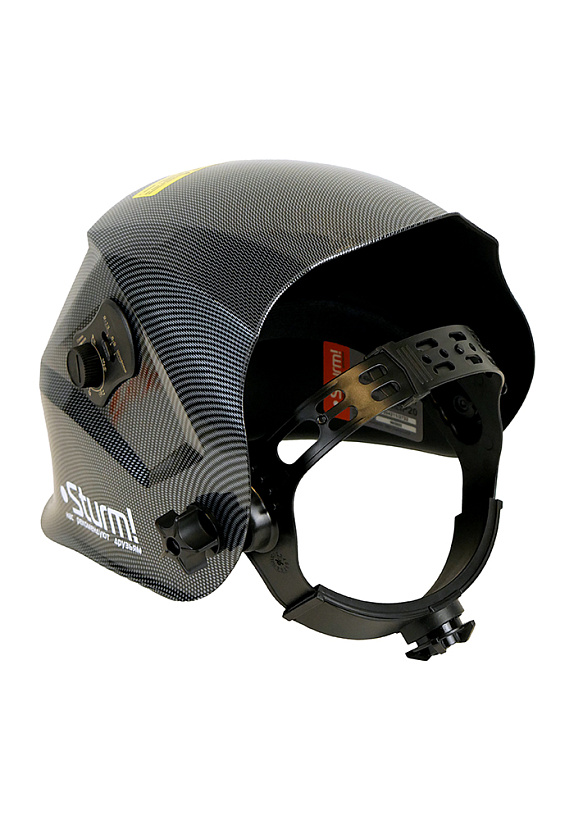 Щиток оснащен удобной крепежной 3D системой с простой настройкой под любой размер головы. Для точной подгонки наголовной ленты применен поворотный механизм с автофиксацией, а комфортное положение маски по высоте можно предварительно выставить с помощью реечного пошагового механизма. Ручка фиксации щитка для удобства имеет крупную насечку, позволяя пользователю выполнить быстрый зажим, не снимая сварочных рукавиц.