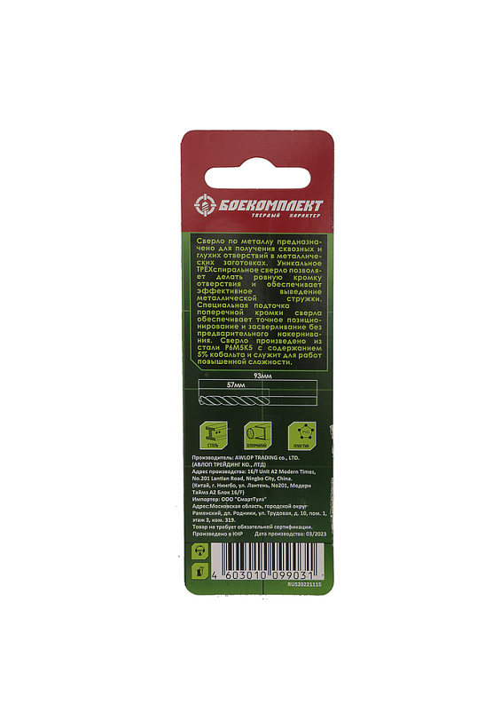 Сверло по металлу ТРЁХСПИРАЛЬНОЕ Кобальт 6,0х93мм БОЕКОМПЛЕКТ