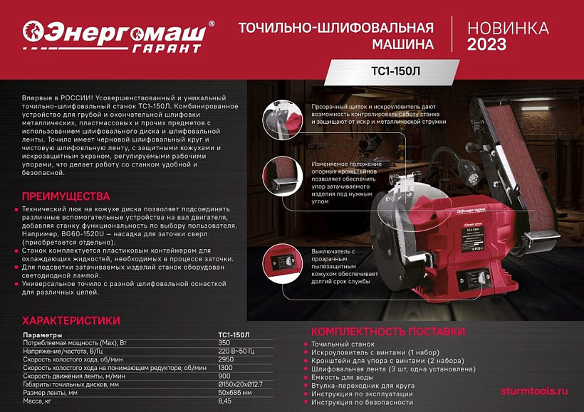 ТС1-150Л является комбинированным устройством для грубой и окончательной шлифовки металлических, пластмассовых и прочих предметов с использованием шлифовального диска и шлифовальной ленты. Точило имеет черновой шлифовальный круг и чистовую шлифовальную ленту, с защитными кожухами и искрозащитным экраном, регулируемыми рабочими упорами, что делает работу со станком удобной и безопасной.