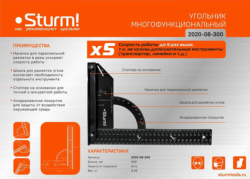 Угольник 200x300мм, разметочный, со стоппером, , Sturm!