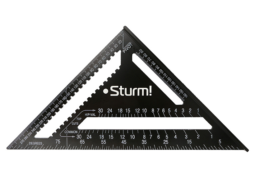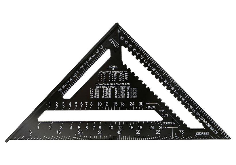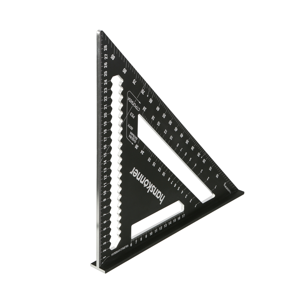 Изделие представляет собой комбинированный угольник для быстрой разметки углов 90° и 45°. Содержит в себе функции транспортира для точной разметки деталей во время производства стропильной системы каркасного дома, системы лестниц и лестничных маршей.