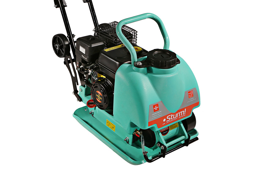 В конструкцию виброплиты вмонтирована система подачи воды на трамбовочную плиту для работ по асфальту с вместительным баком на 13 литров.