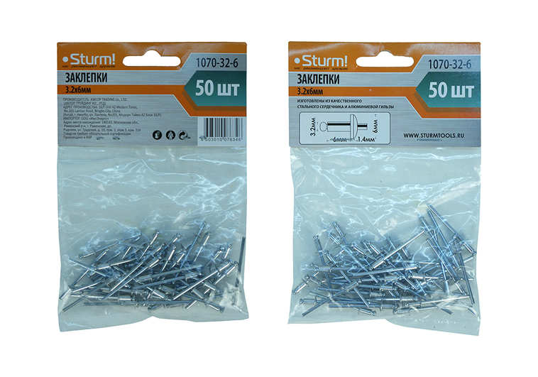 Заклепки Sturm! 1070-32-6 изготовлены из качественного стального сердечника и алюминиевой гильзы, что делает скрепление необходимых поверхностей максимально надёжным.