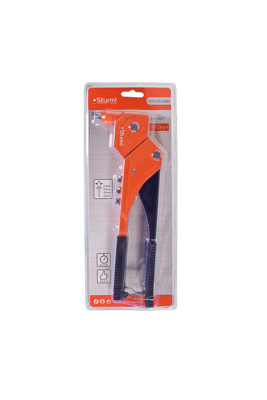 Заклепочник Sturm! 1070-01-A361 способен обрабатывать широкий спектр материалов, включая листовой металл, ткань, кожу и даже ремонт автомобилей. Этот простой в использовании заклепочник должен быть в наборе инструментов любого рабочего или мастера. Комплектация включает 4 типа сменных головок: 3/32" (2,4 мм), 1/8" (3,2 мм), 5/32" (4,0 мм) и 3/16" (4,8 мм).